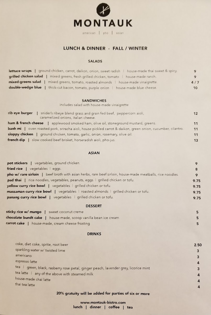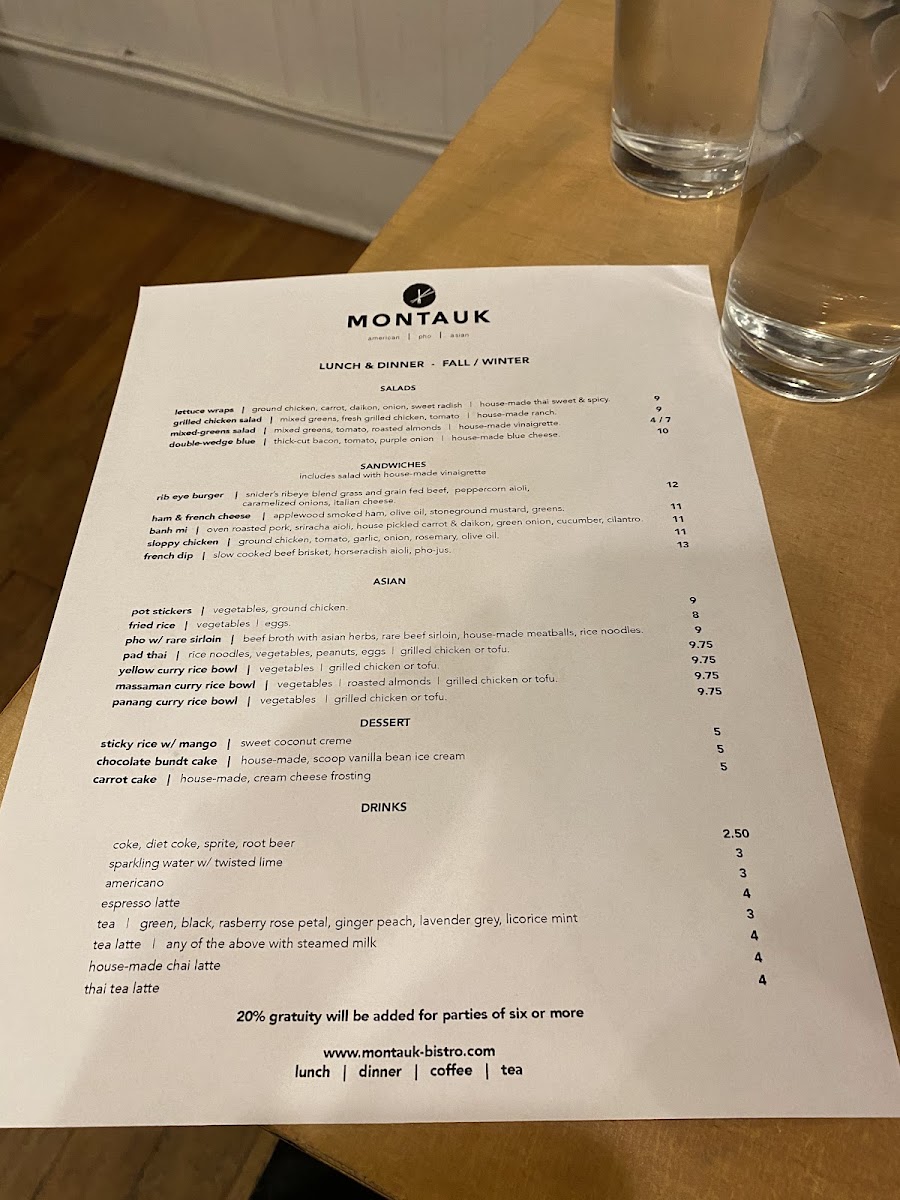 Montauk Bistro's menu is a delightful mix that features mouthwatering salads, hearty Asian classics, and irresistible desserts. The Lettuce Wraps stand out, filled with ground chicken, fresh vegetables, and housemade Thai sweet & spicy sauce, all for just $10. This dish offers a crisp, refreshing crunch that you'll savor. The Grilled Chicken Salad and Mixed Greens Salad, each priced at $10, are also highlights, delivering a symphony of flavors with every bite.
